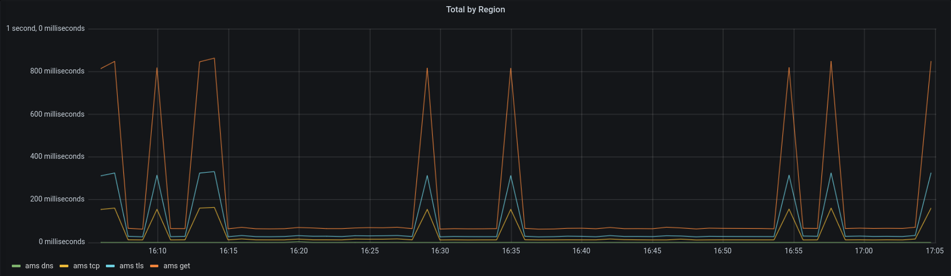 Some of the requests are served from the wrong region (LAX in the previous table). I assume3 that Gcore's GeoDNS service uses some kind of reverse-lookup database to determine where the clients are, and which record to return.