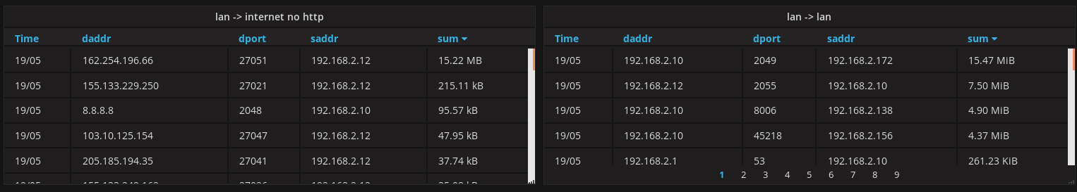 SELECT sum("value") FROM "net_if" WHERE "scidr" = '192.168.2.0/24' AND "dcidr" = '0.0.0.0/0' AND "dport" != '80' AND "dport" != '443' AND "daddr" != '224.0.0.251' AND $timeFilter GROUP BY time(24h), "saddr", "daddr", "dport" fill(none)